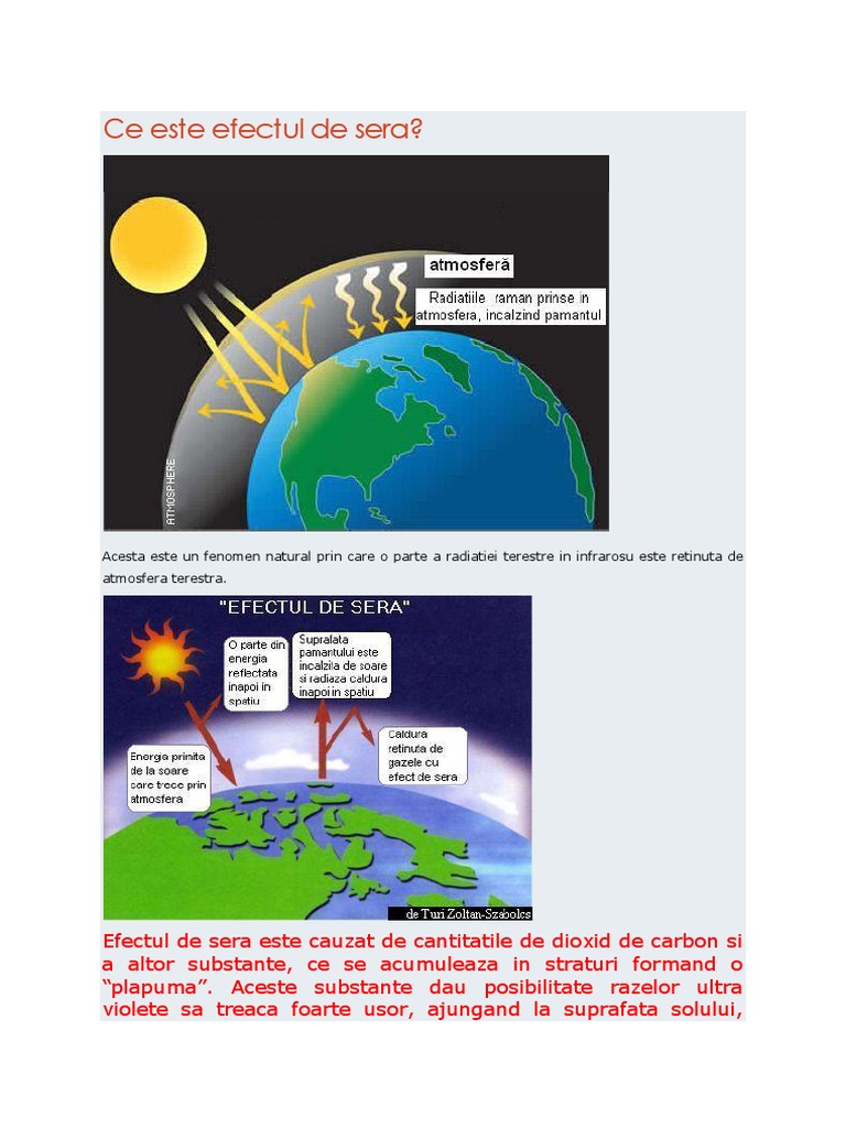 O parte a acestei radiatii este reemisa spre sol, contribuind astfel la reincalzirea straturilor joase ale atmosferei. Diavinad8 și 27 alți utilizatori consideră că acest răspuns este de ajutor. Efectul de sera este un fenomen natural important pentru supravietuirea planetei, care consta in faptul ca, atunci cand razele solare ating atmosfera terestra, o fenomenul a fost descoperit de fizicianul francez joseph fourier, in 1824.